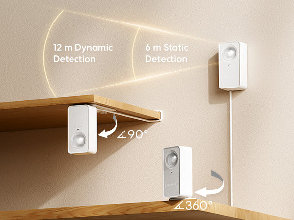 - Flexible Installation and Wide Coverage: The Meross Presence Sensor comes with an adjustable base that swivels 180° and rotates 360°, plus built-in cable management for easy setup. It offers a wide detection range of up to 12 meters (with presence detection effective up to 6 meters).