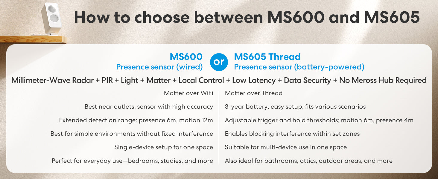 - Upgraded Presence Sensor with Thread: The MS605 adopts the latest Matter over Thread protocol with a cutting-edge Nordic chipset, powered by a long-lasting battery for flexible installation. Combining millimetre-wave radar and infrared motion detection, it can precisely sense subtle movements and human presence. Equipped with a real-time light sensor, it monitors ambient brightness and instantly reports changes to the Matter platform.