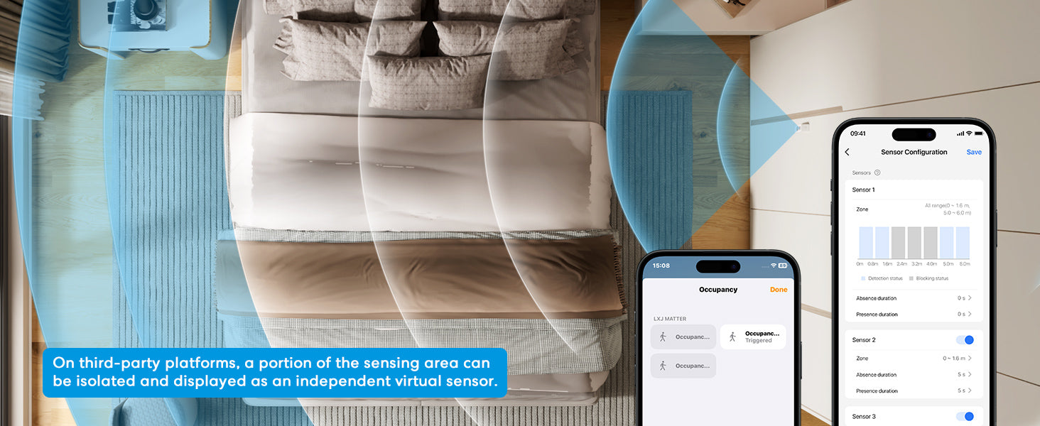 Within third-party platforms, multiple discrete presence sensors are visible. Each sensor can be individually configured via the Meross app to provision exclusive detection zones for each occupant. This enables personalized, zonal automation—during nighttime movement, individuals trigger only their own bedside lamp, ensuring precise, individual illumination without sleep disruption.