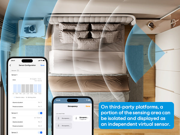 - Three-Zone Smart Scene Control: Divide the detection range into three customizable zones in the Meross App. Each zone can independently set presence/absence conditions and appears as separate sensors on third-party platforms for advanced automation. Examples:Study: 5m → main light on; 2.4m → desk lamp on. Bathroom: 6m → night light on; 4m → bathroom light on; 1.6m for 1s → mirror light on. Smart detection, precise presence sensing, flexible installation — all in one!